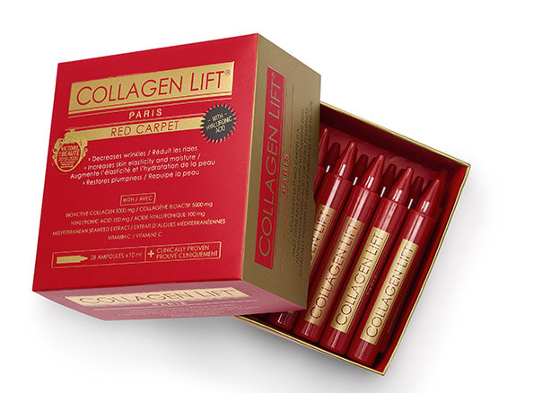Collagen Lift Paris 'RED CARPET' is a potent combination of drinkable collagen, hyaluronic acid, Mediterranean seaweed and vitamin C, which has been shown to reduce wrinkles by up to 50 percent, improve skin elasticity and increase hydration.